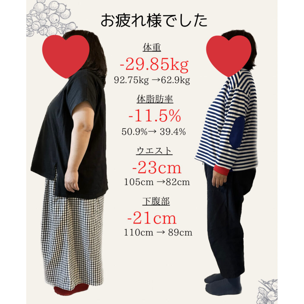 こんにちは!カナです♪いつもご覧頂きありがとうございます! ダイエット卒業された方のBefore Afterです。 3ヶ月のダイエットお疲れ様です! 体重-6.7キロウエスト-4.5センチと素晴らしい結果となりました。 3児のお母さんで小さなお子さんがいらっ... -